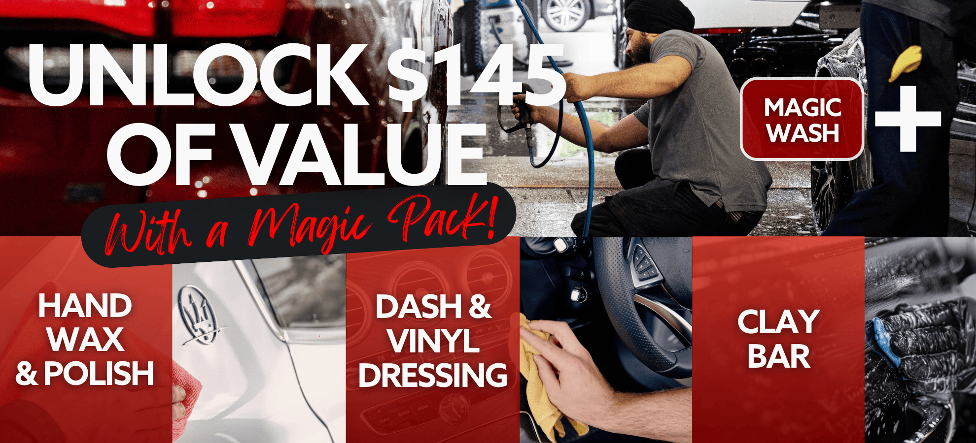 The Magic Pack online offer is valid from 1–24 December and applies exclusively to the services included within the Magic Sack package: Magic Wash, Clay Bar, Hand Wax, and Dash & Vinyl. The offer is not transferable and cannot be substituted, redeemed for cash, or combined with any other promotion. All inclusions can be redeemed only once per purchase and must be redeemed in-store in a single booking, unless otherwise advised by the store. Pricing begins at the sedan rate in each state, with vehicle size upgrades increasing in $10 increments. Magic Hand Carwash reserves the right to amend or withdraw this offer at any time without notice.